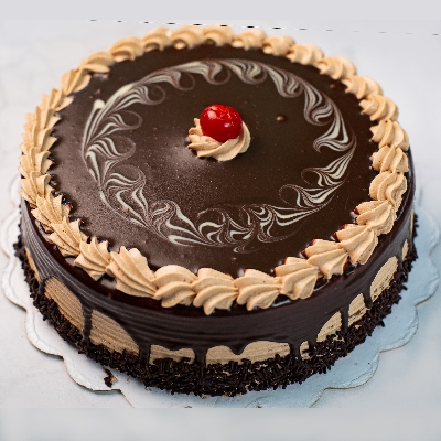 Bizcocho de vainilla relleno con crema de café y chocolate, cubierto con glaseado de chocolate